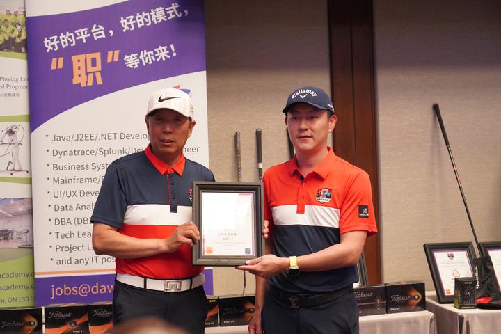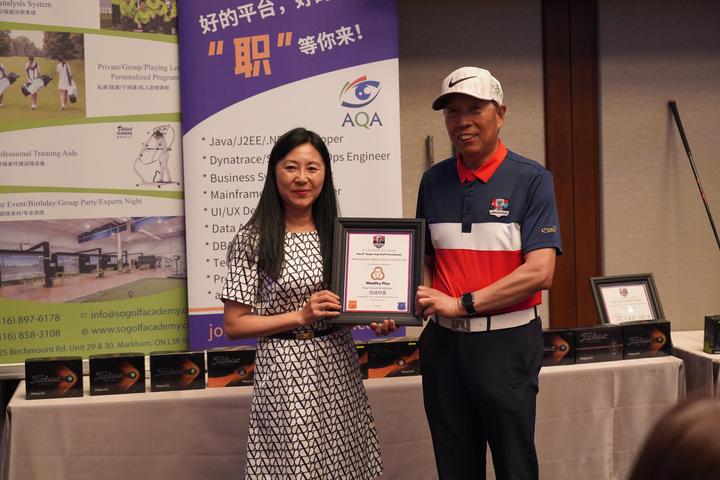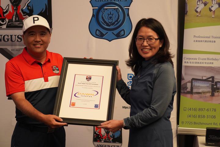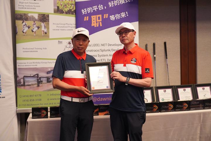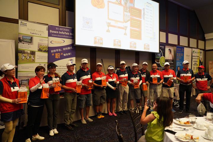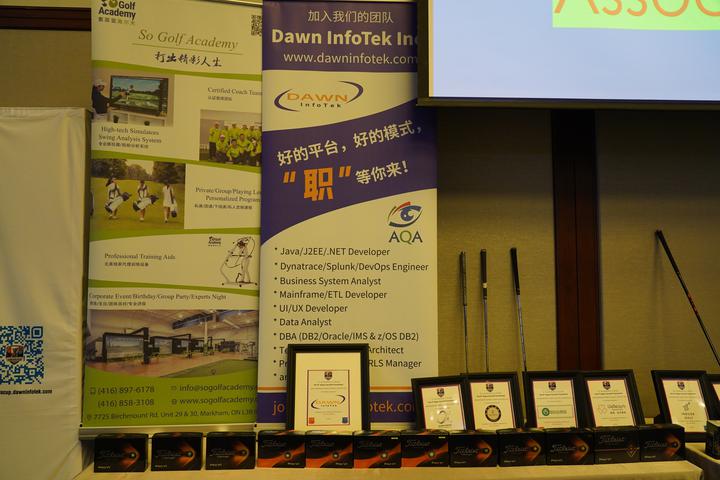 打完球以后就在Angus Glen Golf Course 的宴会厅举行晚宴和颁奖晚会,晚会依然由前几届的主持人Kathy Lin和Peter Lu主持, 他们代表组委会对赞助商和各球会的支持表示了衷心的感谢。