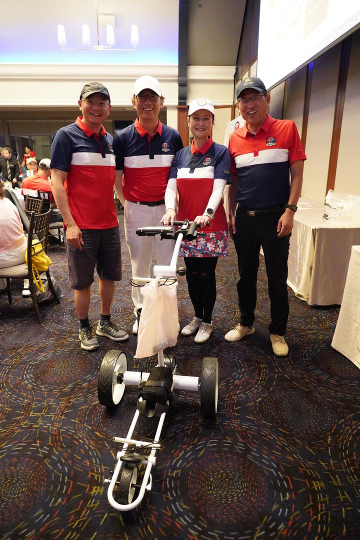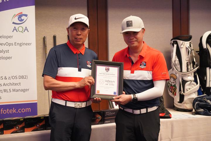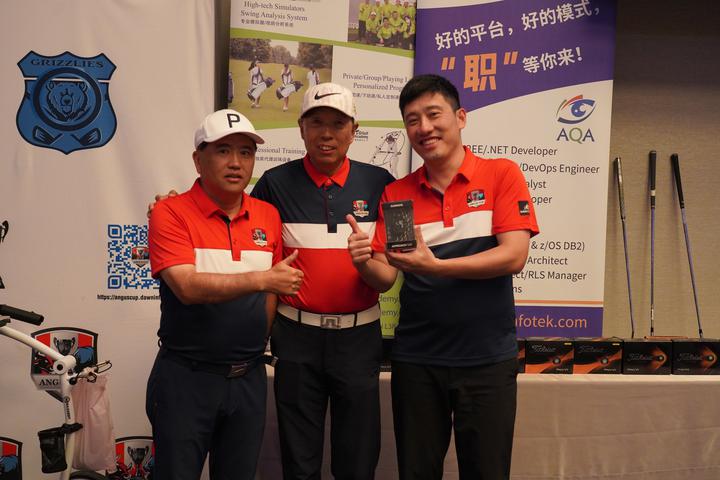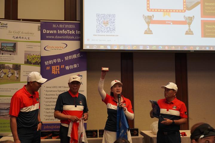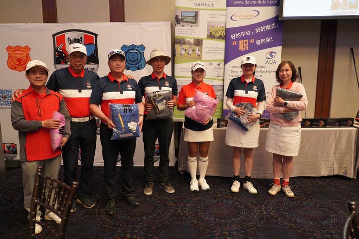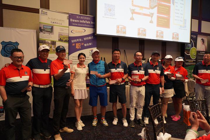 绿鲨队赞助的两个最近洞都被两位美女取得。第二洞 Helen Zang(左5), 第十七洞 Kathy Lin(左4)。 绿鲨队参赛队员为获奖者颁发最近洞奖